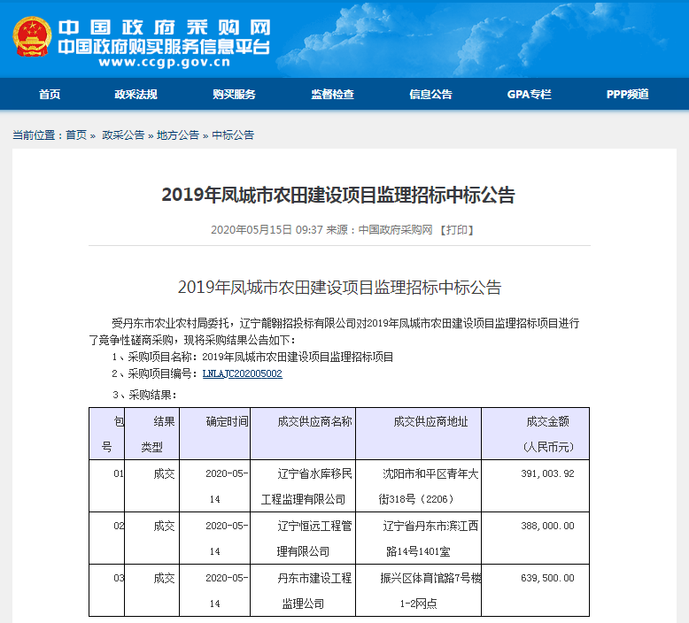 遼寧省水庫移民公司中標(biāo)2019年鳳城市農(nóng)田建設(shè)項(xiàng)目監(jiān)理01包