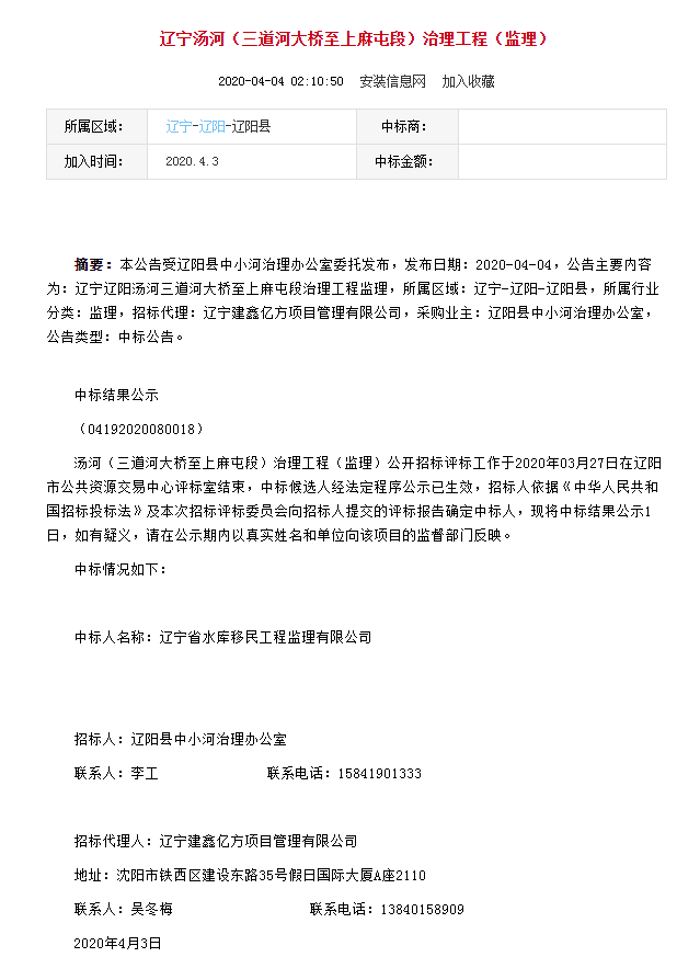 遼寧省水庫移民公司中標(biāo)遼寧湯河(三道河大橋至上麻屯段)治理工程(監(jiān)理)...