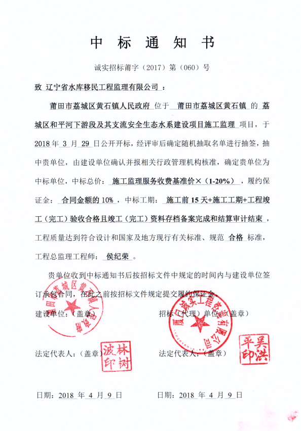 遼寧省水庫(kù)移民公司中標(biāo)荔城區(qū)和平河下游段及其支流安全生態(tài)水系建設(shè)項(xiàng)目施工監(jiān)理...