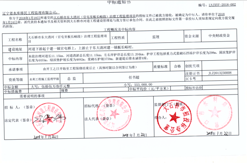 遼寧省水庫(kù)移民公司中標(biāo)大石橋市東大清河(官屯至板長(zhǎng)峪段)治理工程施工監(jiān)理...